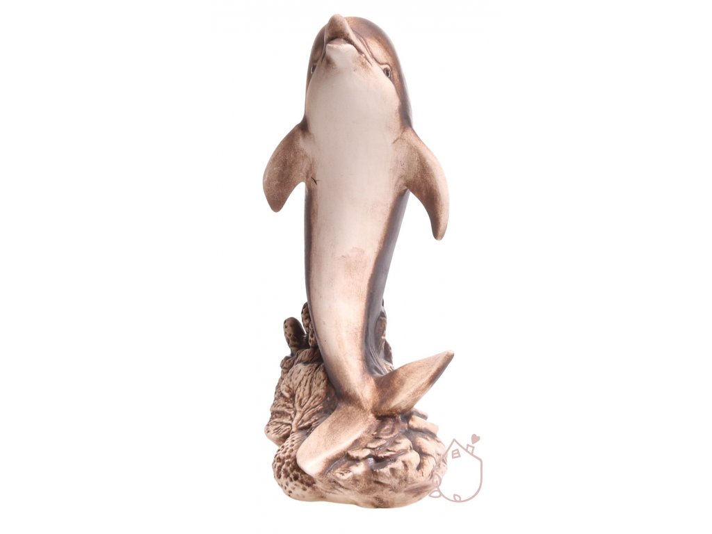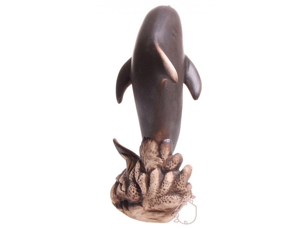 Delfín z keramiky na postavení, stojící v mořské pěně.