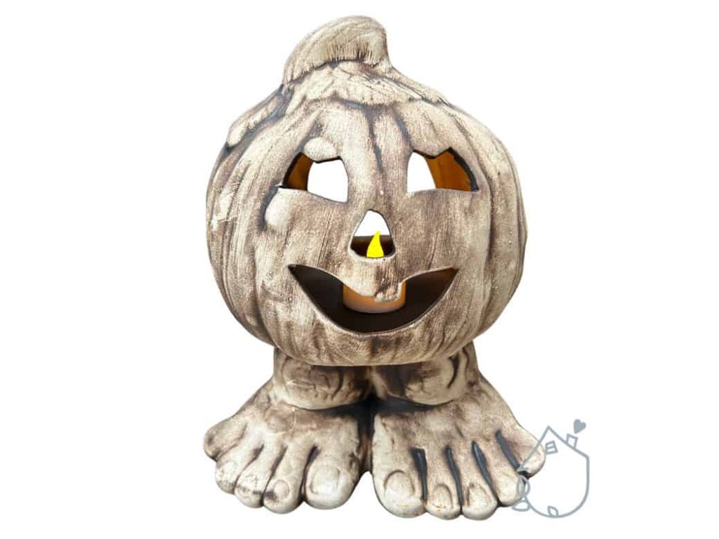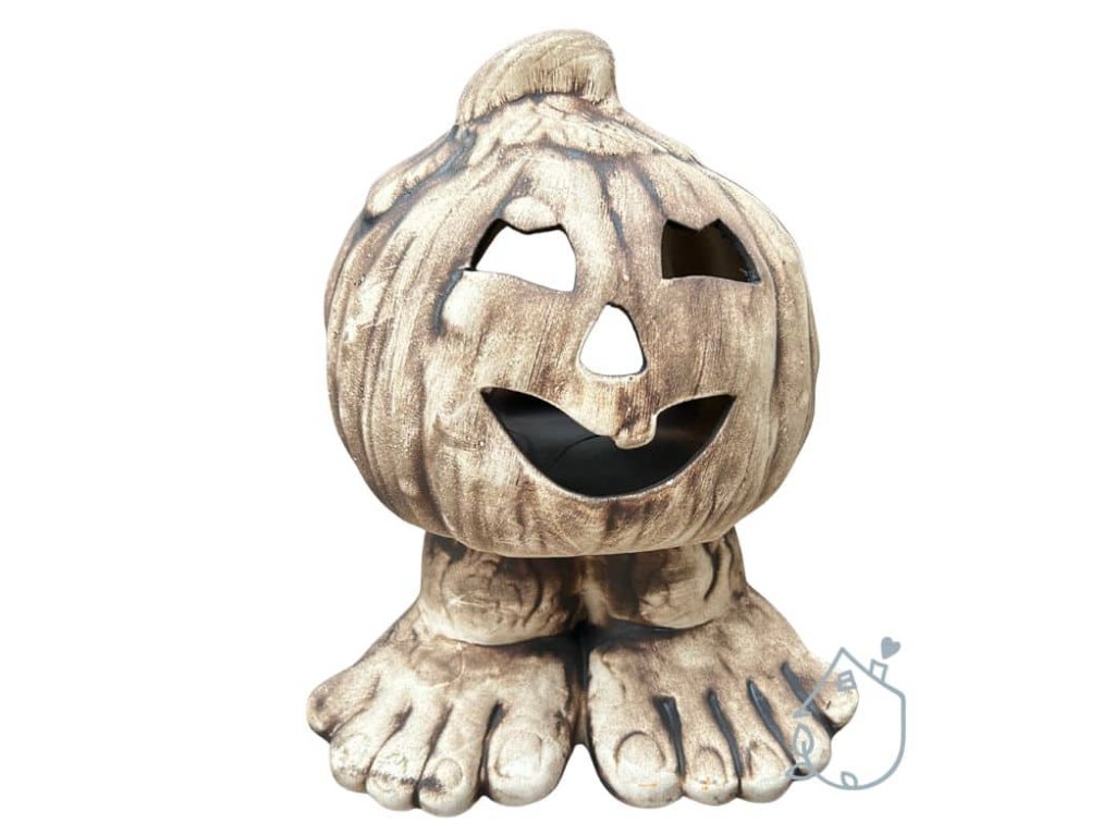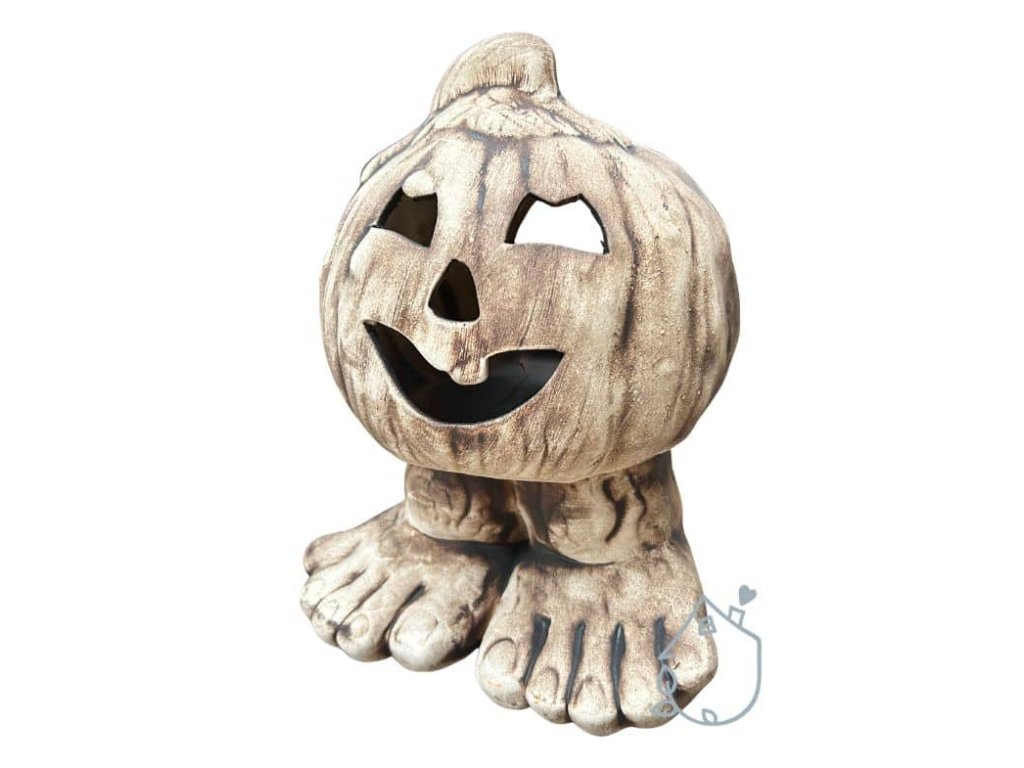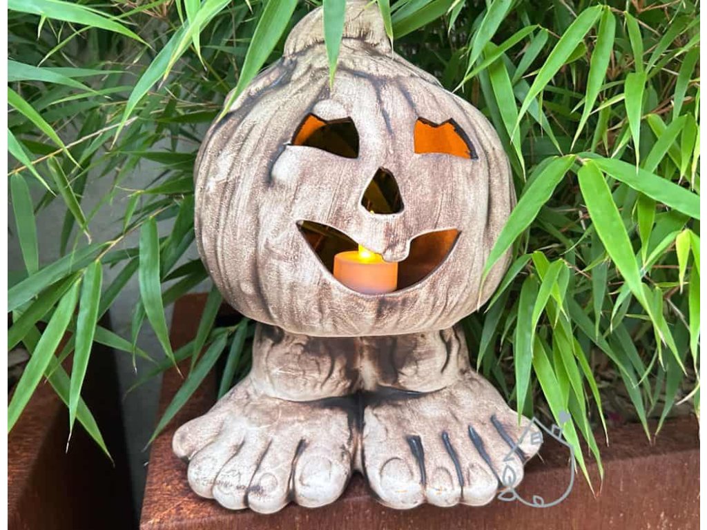 Keramická dýně na nožičkách, můžete do ní vložit svíčku a ona na vás bude v noci ze zahrady strašidelně svítit.