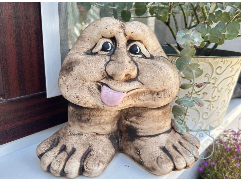 Usměvavý keramický kámen na vás vyplázne jazyk pokaždé když vejdete na zahradu nebo terasu.