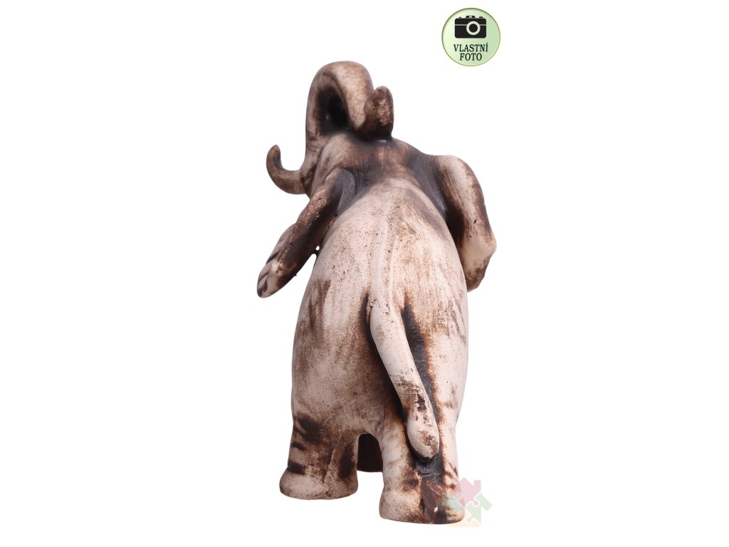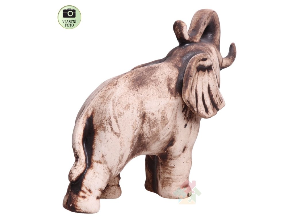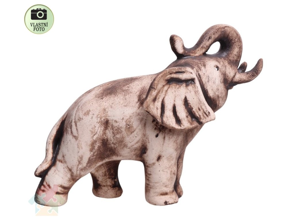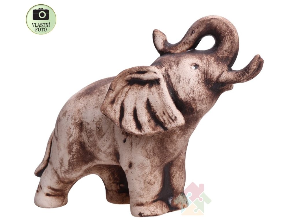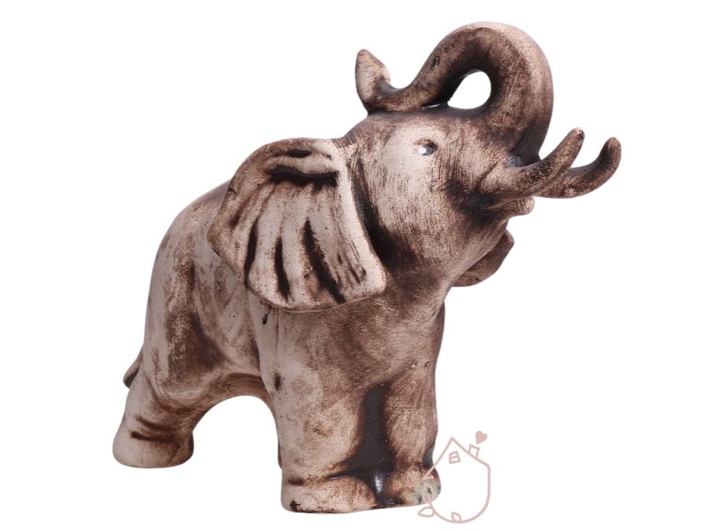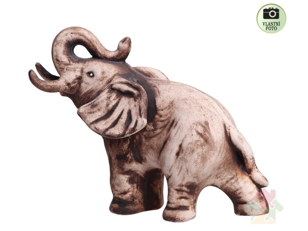 Keramický slon s chobotem nahoru, který nosí štěstí.